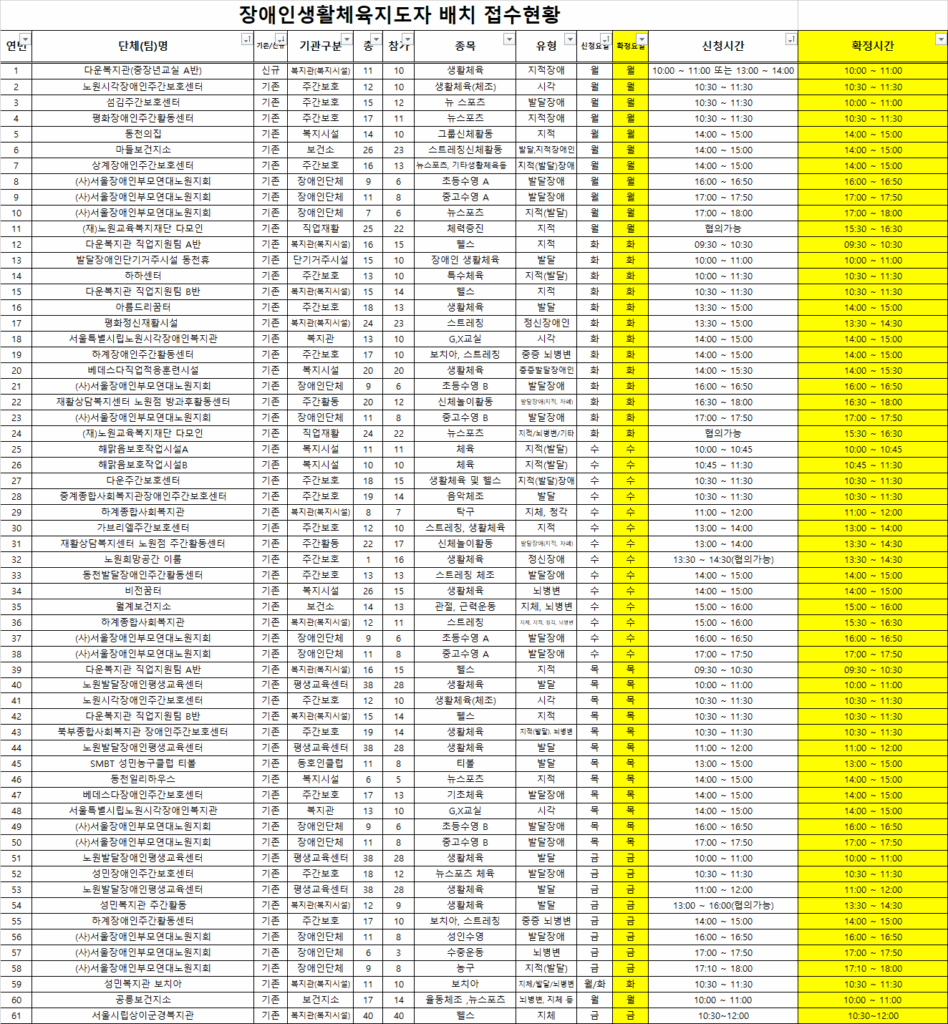 홈체육회알림공지사항 공지사항 2026 상반기 장애인생활체육지도자 배치 확정 안내 작성자 관리자 작성일 2025-12-17 17:13 조회 202 2026년 상반기 노원구 장애인생활체육지도자 배치 확정을 안내하오니 붙임문서를 참고하여 주시기 바랍니다. 좋아요 0 싫어요 0 인쇄 2026-상반기-장애인생활체육지도자-배치-확정현황노원구_게시용.xlsx « [마감]2026 상반기 장애인생활체육지도자 배치신청 공고 2026 장애인 수영교실 참가자 모집 » 목록보기 Powered by KBoard