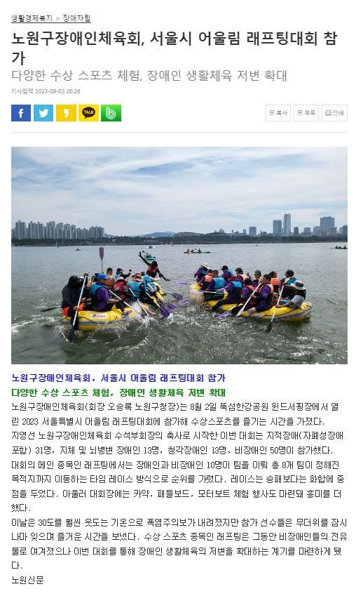 홈체육회알림보도자료 보도자료 [노원신문]노원구장애인체육회, 서울시 어울림 래프팅대회 참가 작성자 관리자 작성일 2023-08-08 04:08 조회 221 좋아요 0 싫어요 0 인쇄 « [아주경제] 오승록 노원구청장, 제10회 노원구 장애인 생활체육대회 참석 [노원신문]장애인체육회-시설관리공단 장애인 체육활동 지원 업무협약 » 목록보기 답글쓰기 Powered by KBoard